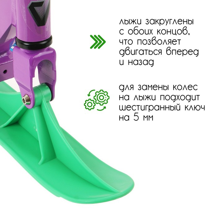 Самокат-снегокат актуален зимой и летом. На колёсах можно кататься по любым ровным поверхностям в сухое время года, зимой — на лыжах по снегу.