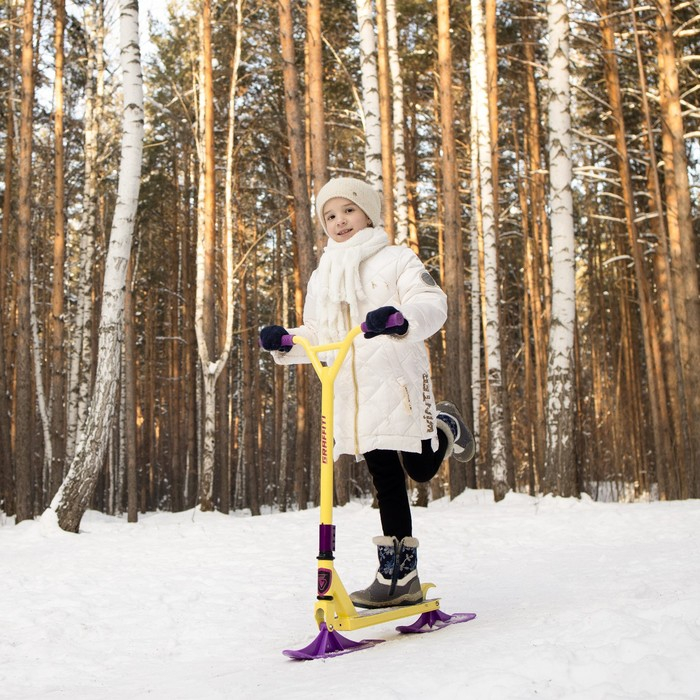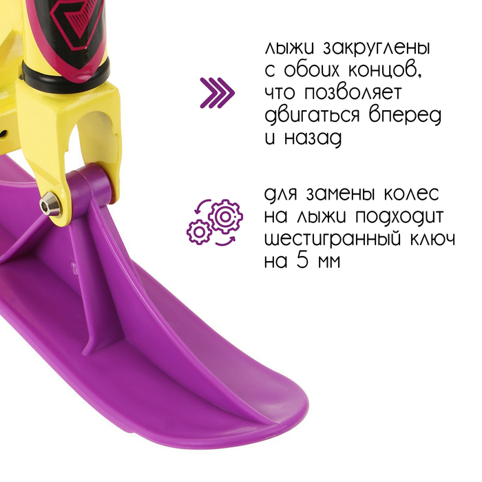 Самокат-снегокат актуален зимой и летом. На колёсах можно кататься по любым ровным поверхностям в сухое время года, зимой — на лыжах по снегу.