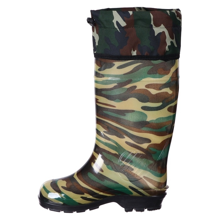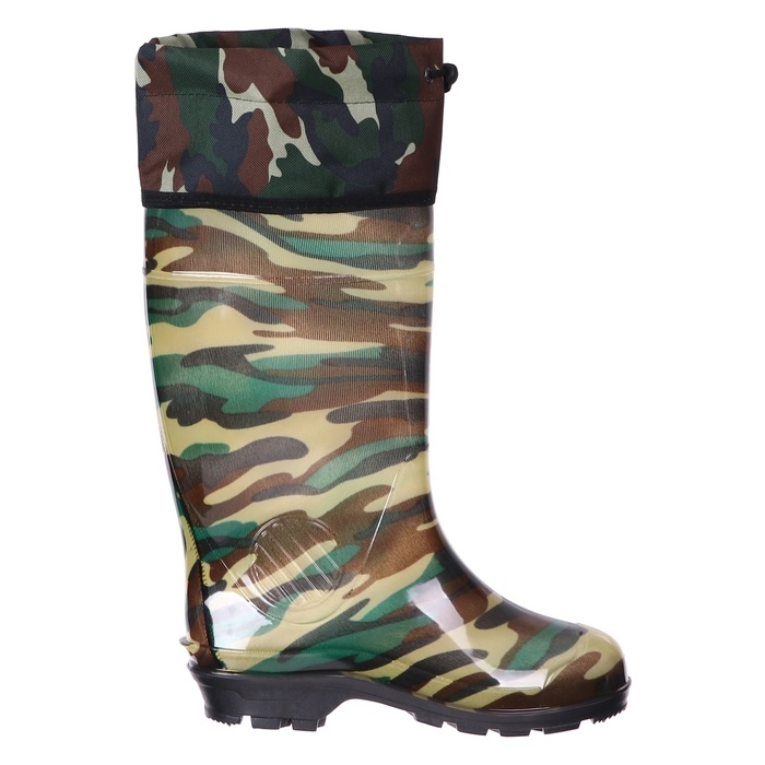 Сапоги мужские изготовлены из ПВХ и предназначены для защиты ног от промокания и загрязнений. Выполнены по технологии однокомпонентного литья методом горячего формования, внутри — тканевое покрытие. Протектор подошвы обладает противоскользящими свойствами. Сапоги удобны и практичны. Нижний температурный предел — -5ͦ. Имеется манжета (надставка) из водоотталкивающей ткани с фиксатором. Выполняется с использованием цветных текстильных чулок.