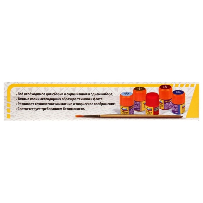 В коробке вы найдёте пластиковые литники с прикреплёнными элементами модели, краски, кисточку, клей и инструкцию по сборке.
