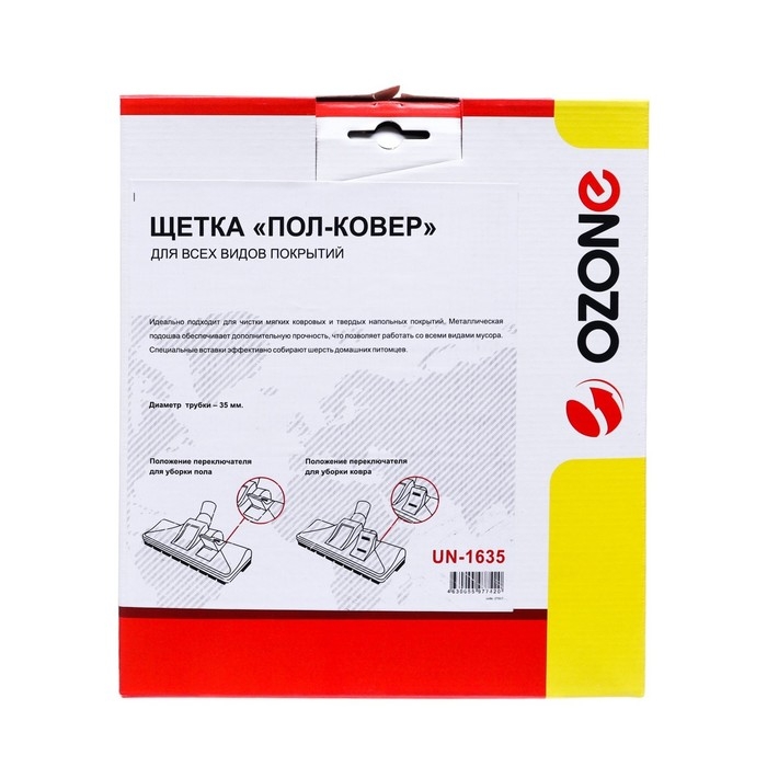 Щетка для пылесоса "Пол-ковер" UN-1635 Ozone - это универсальное решение для уборки любых видов покрытий. Она идеально подходит для чистки ковров, паркета, линолеума и других твердых поверхностей. Щетка оснащена специальными щетинками, которые эффективно удаляют пыль, волосы и другие загрязнения, обеспечивая глубокую и тщательную очистку.