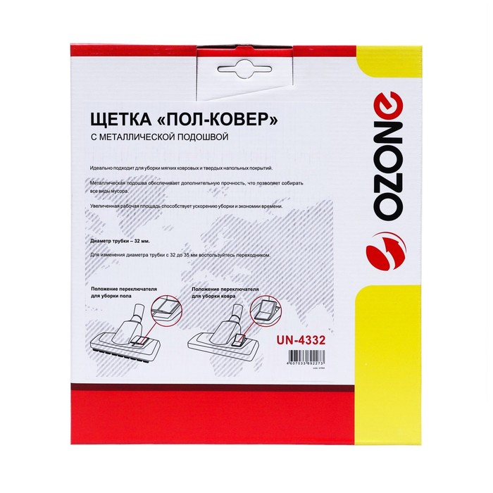 Щетка для пылесоса "Пол-ковер" Ozone с металлической подошвой - это универсальный аксессуар, который позволяет эффективно очищать как твердые, так и ковровые покрытия. Она имеет ширину 270 мм и длину 100 мм, что обеспечивает большую площадь уборки за один проход.