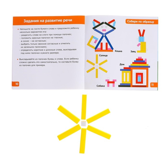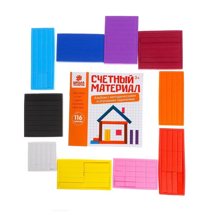 В этом комплекте 116 палочек разной длины и разного цвета. С этим набором малыш усвоит понятия "целое" и "часть", "короче" и "длиннее", "больше" и "меньше" и мн.др. Благодаря разному цвету палочек ребёнок будет развивать образное мышление и усваивать понятие счёта.