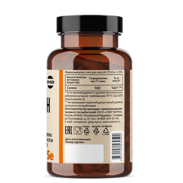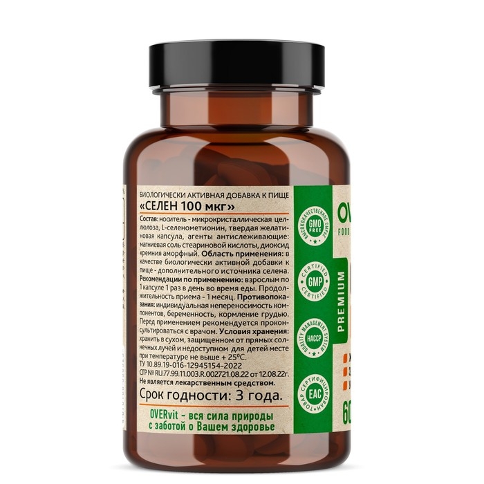 Наполнитель - микрокристаллическая целлюлоза, твердая желатиновая капсула (желатин, вода, краситель - диоксид титана), L-cеленметионин, агенты антислеживающие: диоксид кремния аморфный, магниевая соль стеариновой кислоты.