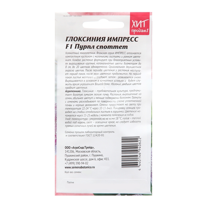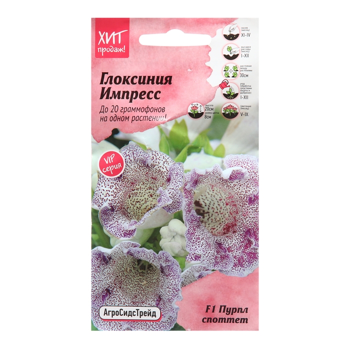 Комнатный многолетник. Японская серия ИМПРЕСС отличается компактным кустиком с маленькими листьями и ранним цветением. Каждое растение формирует при благоприятных условиях выращивания крупные, колокольчатые цветы в диаметре до 8 см, до 20 цветков одновременно. Оригинальная двухцветная окраска цветов. После периода цветения у растения наступает период покоя, после него цветение продолжится. На период покоя листья желтеют и опадают, затем - развиваются снова. Выращивается в основном в комнатных условиях и будет служить ярким украшением Вашего дома. Удаление увядших цветов продлит цветение. Агротехника: Глоксиния – требовательная культура, предпочитает богатую гумусом легкую почву. Растения, выращенные из семян, обильнее цветут и меньше подвержены болезням. Гранулы с семена раскладывают по поверхности слегка уплотненной почвы и хорошо увлажняют. Семена прорастают на свету при температуре 22-24°С через 10-15 дней. Пикировку сеянцев проводят на стадии семядольных листьев в горшочки. Цветение начинается через 15-25 недель с момента появления всходов. Уход: температура - умеренная, но не ниже 18°С, полив – теплой водой под корень, свет – освещение яркое, но следует избегать прямых солнечных лучей во время цветения. Штрих-код -