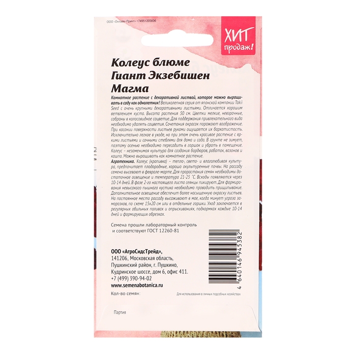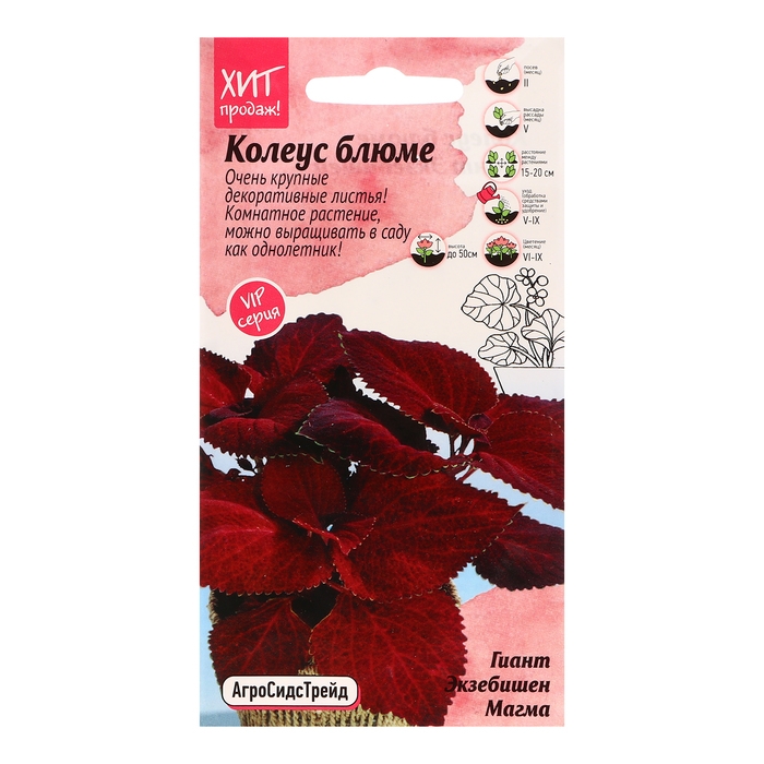 Комнатное растение с декоративной листвой, которое можно выращивать в Саду как однолетник! Великолепная серия от японской компании Takii Seed с очень крупными декоративными листьями. Отличается хорошим ветвлением куста. Высота растения 50 см. Цветки мелкие, невзрачные, собраны в колосовидное соцветие. Для поддержания привлекательного вида необходимо удалять соцветия. Сочетания окрасок поражают воображение. При касании поверхности листьев руками ощущается их бархатистость. Исключительно легкое в уходе, но при этом очень красивое растение с яркими листьями и сочными стеблями для дома и сада. В грунте не зимует, поэтому осенью необходимо пересадить в горшок и убрать в помещение. Колеус – незаменимая культура для создания бордюров, рабаток, вазонов и кашпо. Можно выращивать как комнатное растение. Агротехника: Колеус (крапивка) – тепло-, свето- и влаголюбивая культура, предпочитает плодородные хорошо окультуренные почвы. На рассаду семена высевают в феврале-марте. Для прорастания семян необходимо достаточное освещение и температура 21-25˚С. Всходы появляются через 10-14 дней. В фазе 2-го настоящего листа сеянцы пикируют. Для формирования невысокого пышного кустика необходимо проводить прищипывание. Дополнительное освещение обеспечит более насыщенную окраску листьев. На постоянное место рассаду высаживают в мае, когда минует угроза заморозков, по схеме 15х20 см или в отдельные горшки. Уход заключается в регулярных обильных поливах и опрыскиваниях, подкормках каждые 10-14 дней и формирующих обрезках. Штрих-код -