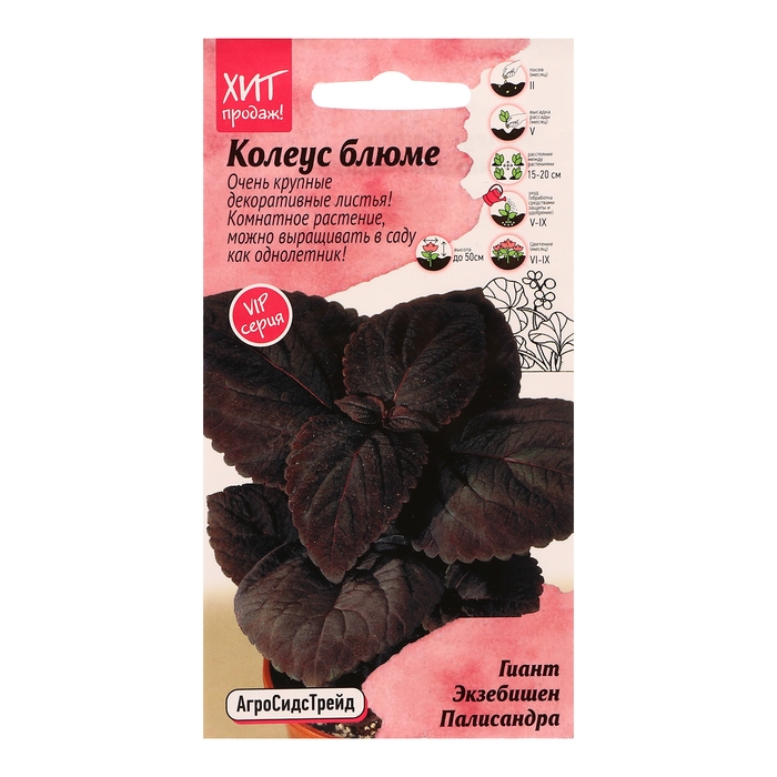 Комнатное растение с декоративной листвой, которое можно выращивать в Саду как однолетник! Великолепная серия от японской компании Takii Seed с очень крупными декоративными листьями. Отличается хорошим ветвлением куста. Высота растения 50 см. Цветки мелкие, невзрачные, собраны в колосовидное соцветие. Для поддержания привлекательного вида необходимо удалять соцветия. Сочетания окрасок поражают воображение. При касании поверхности листьев руками ощущается их бархатистость. Исключительно легкое в уходе, но при этом очень красивое растение с яркими листьями и сочными стеблями для дома и сада. В грунте не зимует, поэтому осенью необходимо пересадить в горшок и убрать в помещение. Колеус – незаменимая культура для создания бордюров, рабаток, вазонов и кашпо. Можно выращивать как комнатное растение. Агротехника: Колеус (крапивка) – тепло-, свето- и влаголюбивая культура, предпочитает плодородные хорошо окультуренные почвы. На рассаду семена высевают в феврале-марте. Для прорастания семян необходимо достаточное освещение и температура 21-25˚С. Всходы появляются через 10-14 дней. В фазе 2-го настоящего листа сеянцы пикируют. Для формирования невысокого пышного кустика необходимо проводить прищипывание. Дополнительное освещение обеспечит более насыщенную окраску листьев. На постоянное место рассаду высаживают в мае, когда минует угроза заморозков, по схеме 15х20 см или в отдельные горшки. Уход заключается в регулярных обильных поливах и опрыскиваниях, подкормках каждые 10-14 дней и формирующих обрезках. Штрих-код -