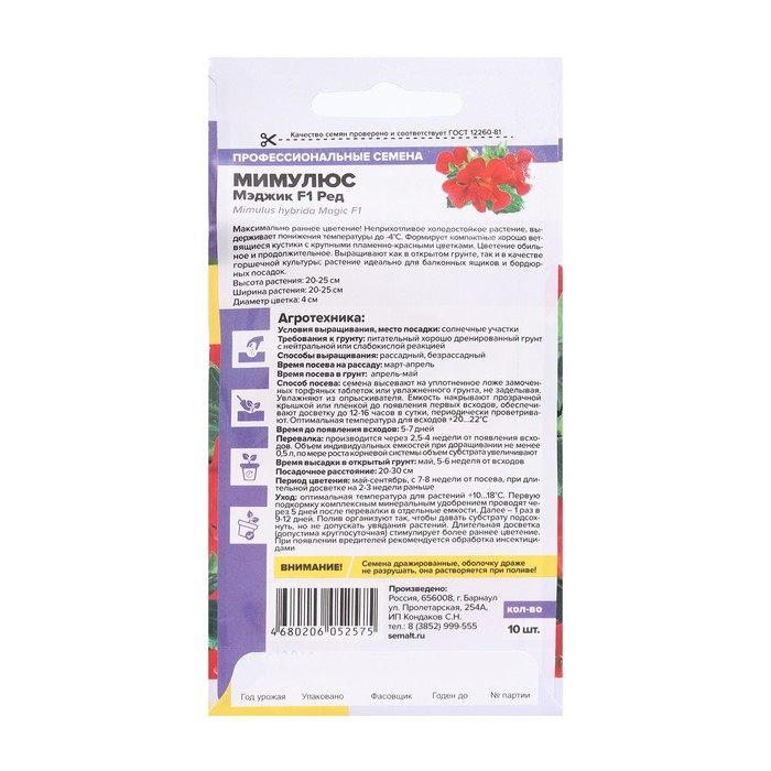 Семена цветов Мимулюс "Мэджик", ред, Сем. Алт, ц/п, 10 шт