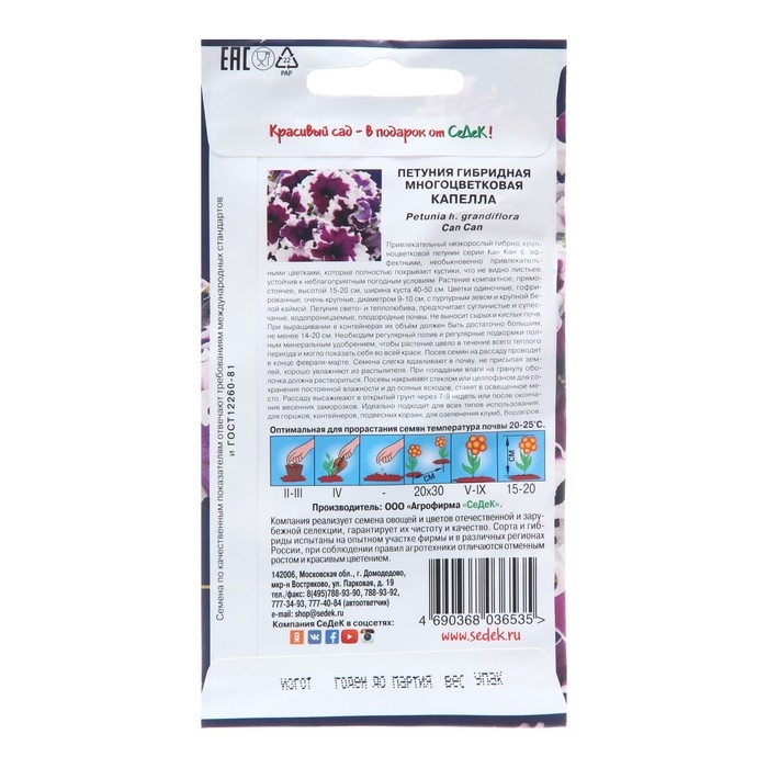 Привлекательный низкорослый гибрид крупноцветковой петунии серии Кан Кан с эффектными, необыкновенно привлекательными цветками, которые полностью покрывают кустики, что не видно листьев, устойчив к неблагоприятным погодным условиям. Растение компактное, прямостоячее, высотой 15-20 см, ширина куста 40-50 см. Цветки одиночные, гофрированные, очень крупные, диаметром 9-10 см, с пурпурным зевом и крупной белой каймой. Петуния свето- и теплолюбива, предпочитает суглинистые и супесчаные, водопроницаемые, плодородные почвы. Не выносит сырых и кислых почв. При выращивании в контейнерах их объём должен быть достаточно большим, не менее 14-20 см. Необходим регулярный полив и регулярные подкормки полным минеральным удобрением, чтобы растение цвело в течение всего теплого периода и могло показать себя во всей красе. Посев семян на рассаду проводят в конце Февраля-Марте. Семена слегка вдавливают в почву, не присыпая землей, хорошо увлажняют из распылителя. При попадании влаги на гранулу оболочка должна раствориться. Посевы накрывают стеклом или целлофаном для сохранения постоянной влажности и до полных всходов, ставят в освещенное место. Рассаду высаживают в открытый грунт через 7-9 недель или после окончания весенних заморозков. Идеально подходит для всех типов использования: для горшков, контейнеров, подвесных корзин, для озеленения клумб, бордюров.Оптимальная для прорастания семян температура почвы 20-25º С.