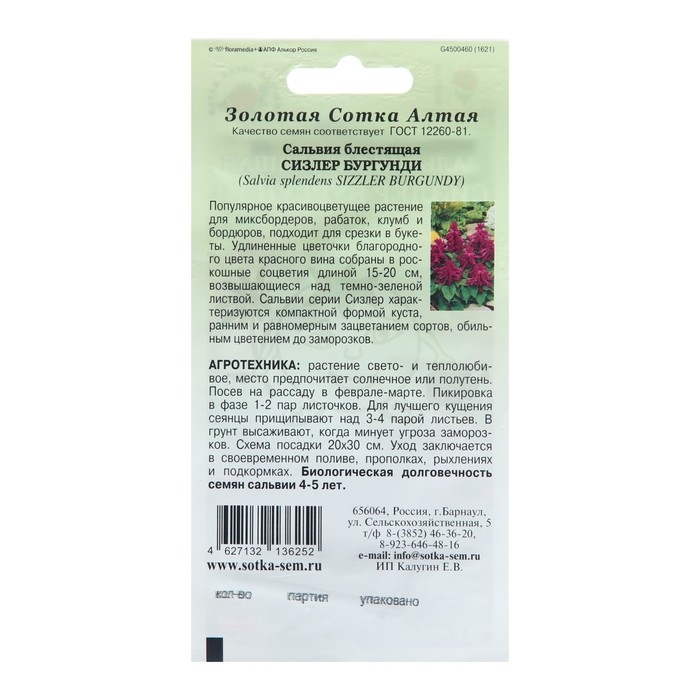 Семена цветов Сальвия "Сизлер Бургунди", 10 шт