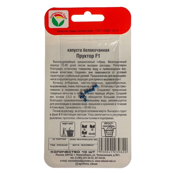 Капуста Пруктор F1 - среднепоздний гибрид белокочанной капусты. От высадки 45-дневной рассады до технической спелости 73–75 дней. Розетка листьев приподнятая до горизонтальной. Листья средние, серо-зеленые с восковым налетом средней интенсивности, пузырчатые, слабоволнистые. Кочан округло-вытянутой формы, покрытый, плотный, на разрезе беловатый, массой 3–5 кг. Внутренняя кочерыга короткая. Гибрид холодостойкий и жаростойкий. Вкусовые качества свежей и квашеной продукции отличные. Товарность высокая. Гибрид белокочанной капусты Пруктор F1 устойчив к фузариозному увяданию (Foc). Хорошо сохраняется на корню, что дает гибкость при сборе урожая. Рекомендуется для использования в свежем виде, квашения и хранения 4–5 месяцев. Подходит для прямого посева в грунт. Схема посадки 70х40 см. Урожайность 8–10 кг/м2.