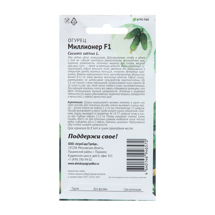 Семена Огурец "Миллионер" F1 раннеспелый, урожайный, партенокарпический, 7 шт