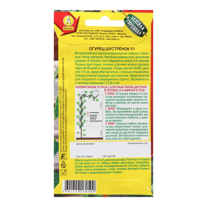 Мегаурожайный партенокарпический гибрид с букетным типом цветения. Растение компактное, ветвление среднее. В каждом узле образуется около 3-6 завязей. Первые хрустящие, сочные огурчики можно срывать через 45-48 дней от всходов. Плоды массой 50-90 г, длиной 7-9 см, среднебугорчатые, с белым опушением. Гибрид отлично подходит для засолки. Предназначен для открытого и защищенного грунта. Урожайность в теплице превышает 17-22 кг/м2.Можно вырастить 20-25-дневную рассаду. Плотность посадки 2-3 растения на 1 м 2 . Гибрид требует регулярных подкормок. Налив завязей в пучке последовательный, поэтому собирать плоды нужно ежедневно, чтобы питание беспрепятственно поступало к формирующимся плодам.