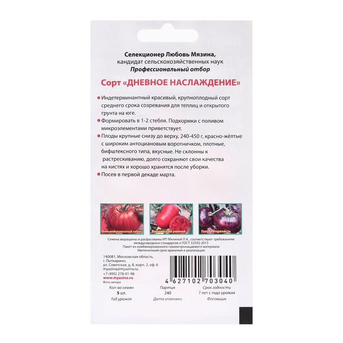 Индетерминантный красивый, крупноплодный сорт среднего срока созревания для теплиц и открытого грунта на юге. Формировать в 1-2 стебля. Подкормки с поливом микроэлементами приветствуются. Плоды крупные снизу до верху, 240-450 г, красно-жёлтые с широким антоциановым воротничком, плотные, бифштексного типа, вкусные. Не склонны к растрескиванию, долго сохраняют свои качества на кистях и хорошо хранятся после уборки. Посев в первой декаде марта.