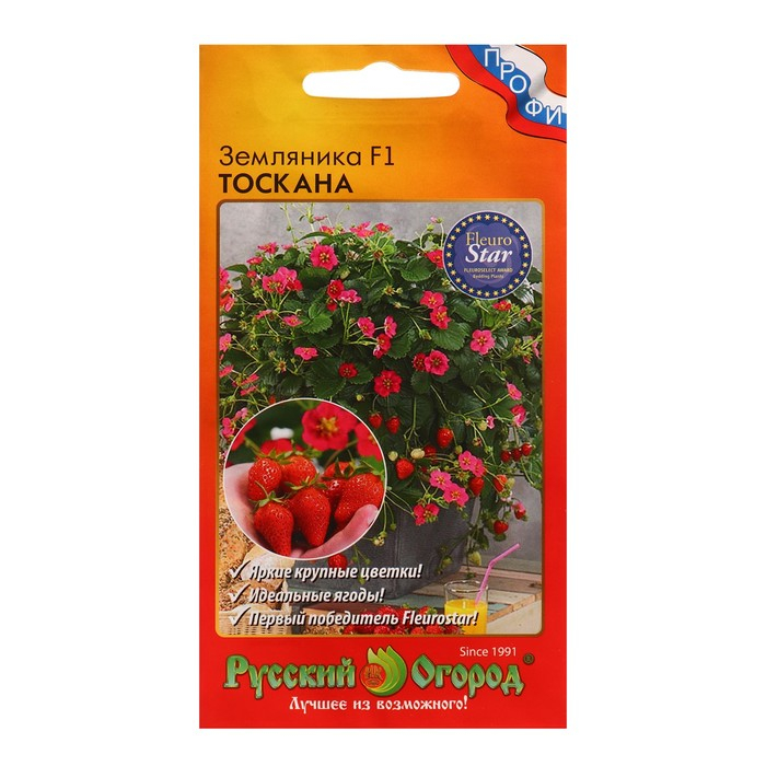 Ремонтантная земляника F1 Тоскана формирует мощные растения с несколькими побегами и большими ярко-розовыми цветками. Цветение и плодоношение начинается рано и продолжается на боковых побегах все лето. Ягоды кони-ческой формы, среднего размера, сочные и сладкие. Производство рассады этого гибрида чрезвычайно экономично и выгодно, так как гибрид отличается отличной всхожестью и выровненностью.