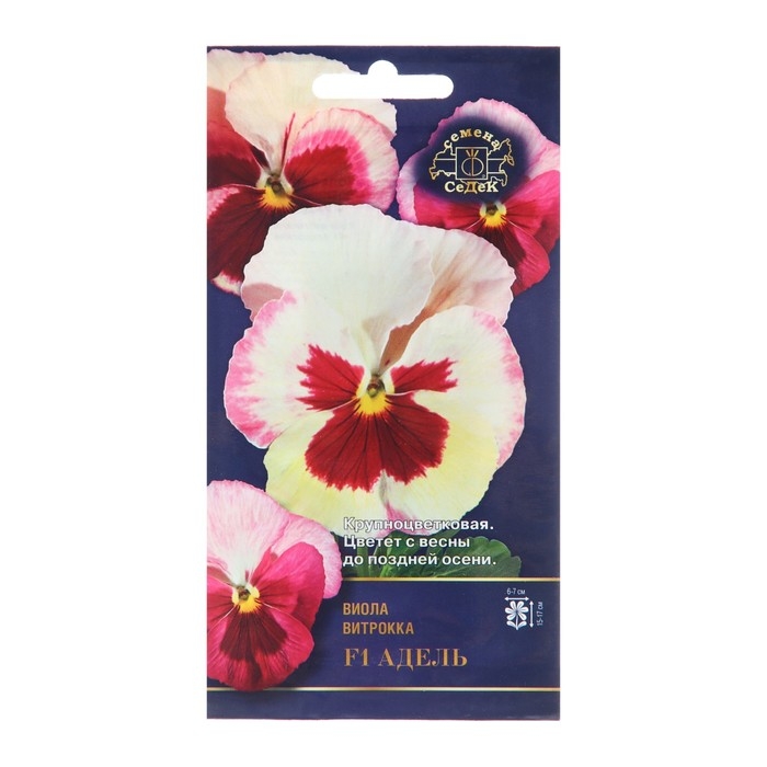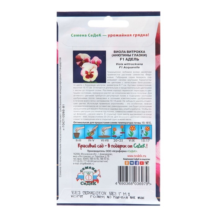 Традиционно любимое всеми двулетнее травянистое растение семейства Фиалковые. Гибридная серия Акварель очаровывает своими крупными бархатистыми цветками с лепестками бело-розового цвета с бордовым центром, диаметром 6-7 см. Кустики прямостоячие, высотой 15-17 см. Отличается длительным и продолжительным цветением с весны до поздней осени. Растение хорошо переносит пересадку в цветущем состоянии, прекрасно растет на солнечном месте и в полутени. Для активного цветения требуется регулярный полив и подкормки азотными удобрениями после пикировки и полными комплексными удобрениями в течение всего лета с интервалом 10-14 дней. Не забудьте удалять отцветшие цветки. Используя правильно агротехнику - эта особенная, нежная и романтичная виола не оставит вас равнодушными, она будет роскошным украшением для вашего балкона и садовых ваз, клумб и рабаток. Чтобы получить цветущие растения в год посева, семена высевают на рассаду в конце Февраля - начале Марта. В открытый грунт виолу высаживают в конце Апреля - Мае, на расстоянии 20-25 см. Для весеннего цветения семена высевают в помещении или в открытый грунт в июне-июле.