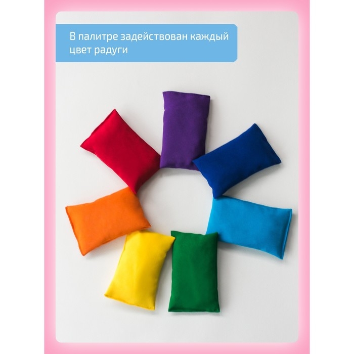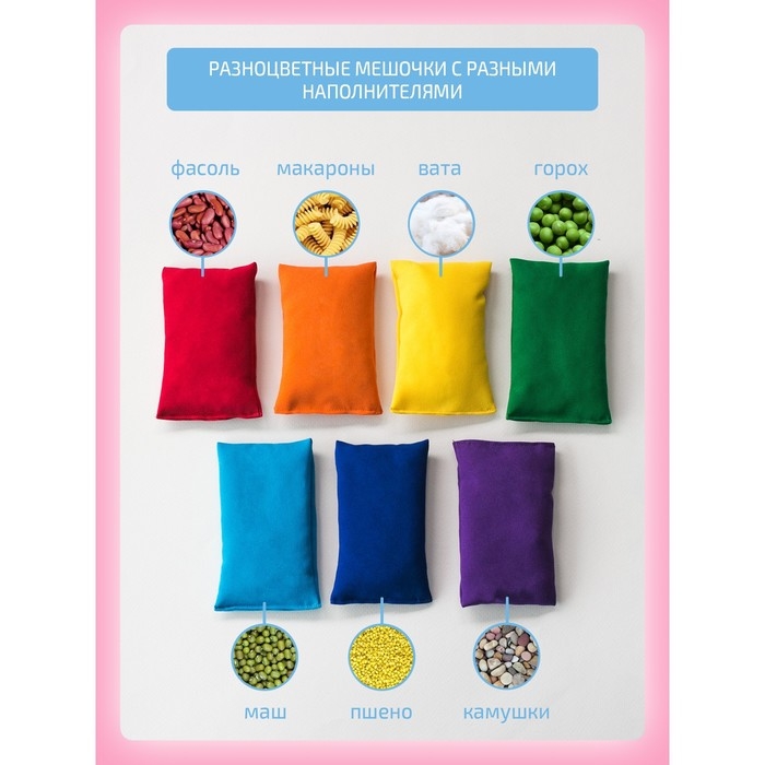 Сенсорные мешочки изготовлены из мягкого габардина и имеют прочные швы. Они прямоугольной формы и представлены в различных цветах, охватывающих всю радугу. Внутри каждого мешочка находится разный наполнитель: горох, фасоль, пшено, ватный шарик, маш, макароны и мелкие камушки.