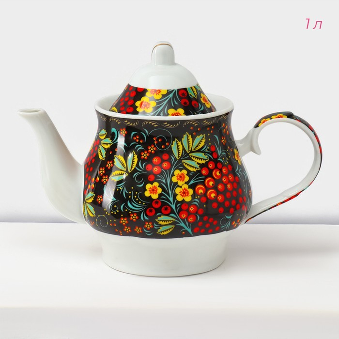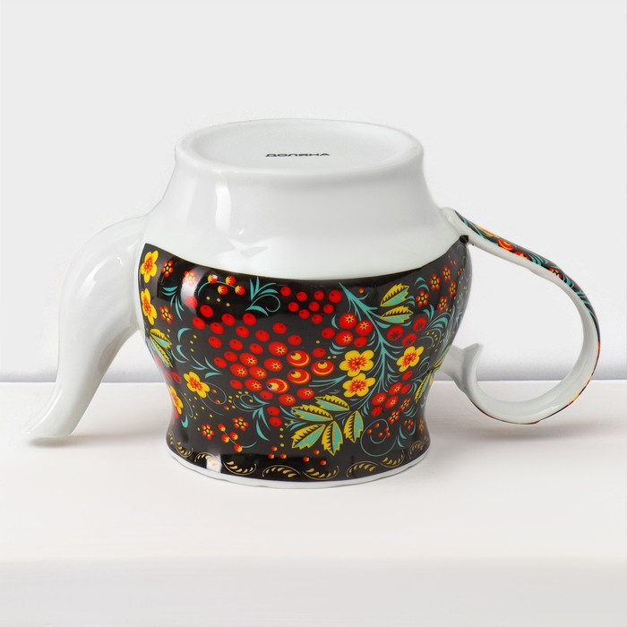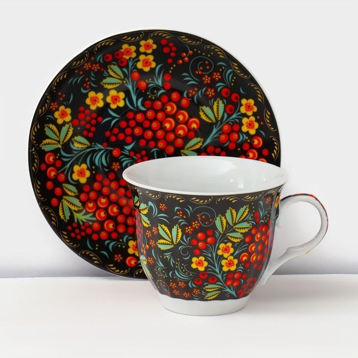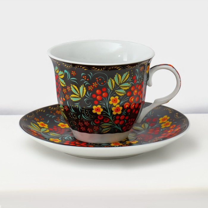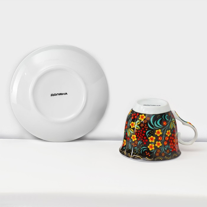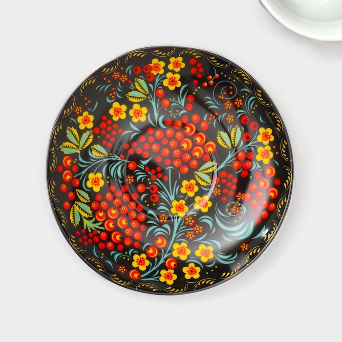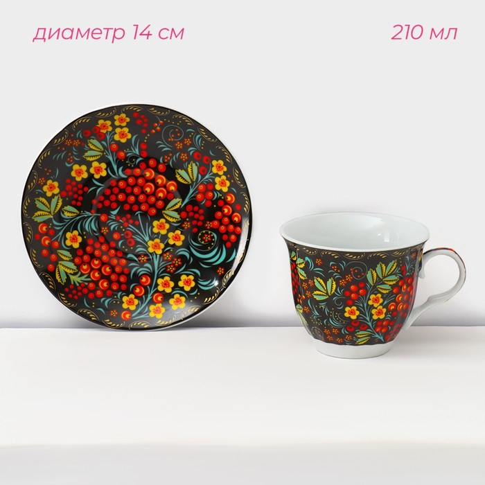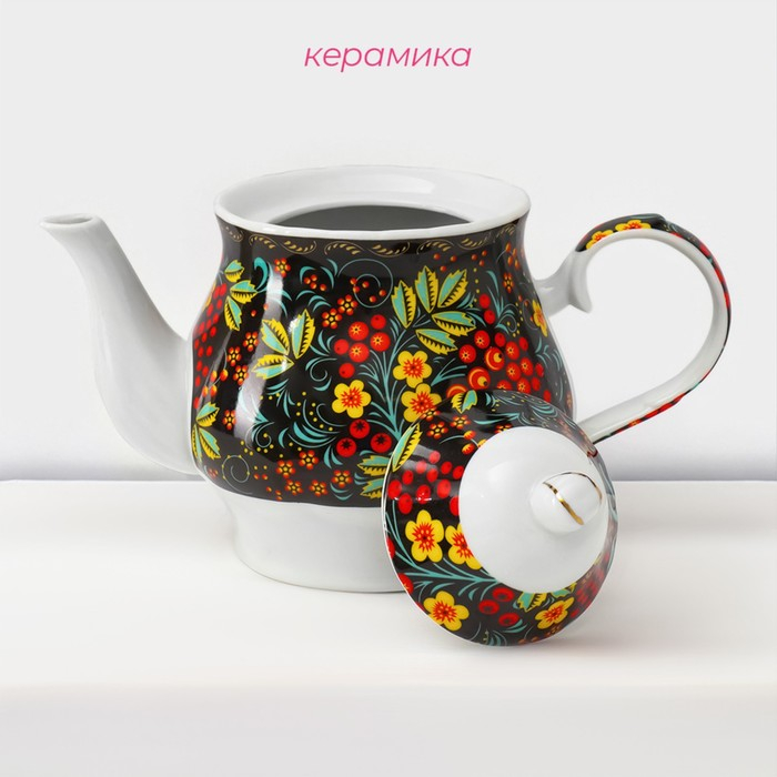 Сервиз чайный керамический на металлической подставке Доляна «Хохлома», 13 предметов: 6 чашек 210 мл, 6 блюдец d=14 см, чайник 1 л