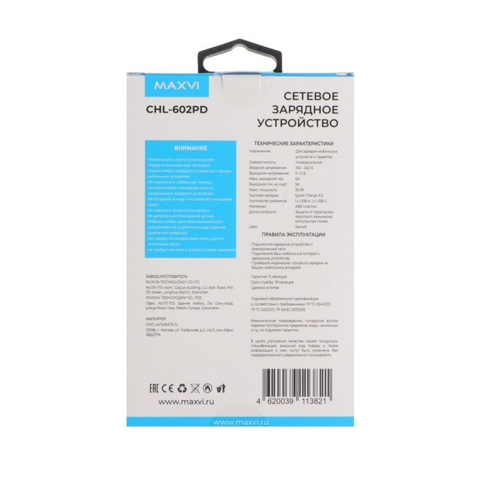 СЗУ Maxvi CHL-602PD - это универсальный сетевой адаптер с портами USB-A и USB-C, который предназначен для заряда аккумуляторов Ваших мобильных устройств от сети переменного тока. Отличительной особенностью модели является поддержка функции быстрой зарядки по технологии Quick Charge 3.0. Корпус зарядного устройства выполнен в элегантном дизайне, сочетающий в себе классику и современные технологии, а также изготовлен из огнеупорного материала.