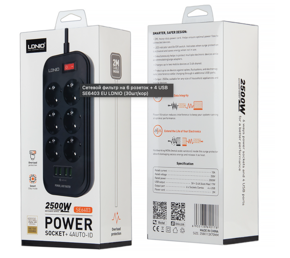 Сетевой фильтр на 6 розеток + 4 USB SE6403 EU LDNIO
