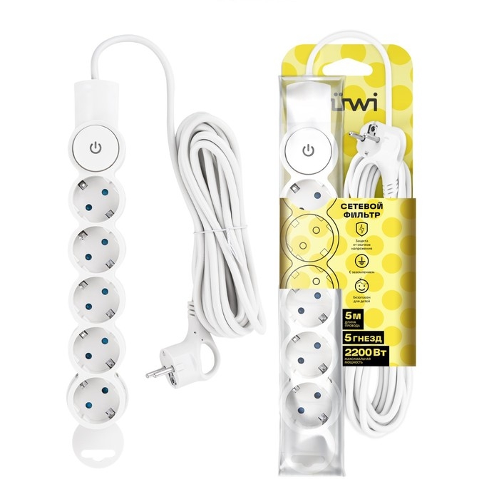 Сетевой фильтр, 5 гнезд, 5м, с/з, со шторками, с выкл, 2200Вт, 10А, бел, 32577 2, duwi