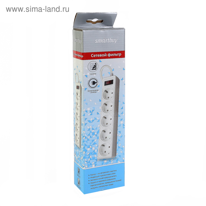 Сетевой фильтр Smartbuy, 5 розеток, 1.8 м, 10 А, 2200 Вт, с з/к, с выкл., белый