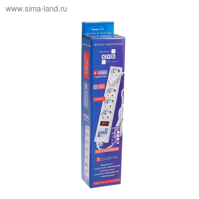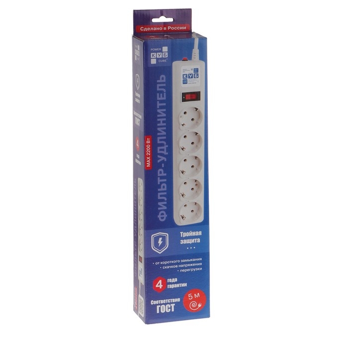 Сетевой фильтр Power Cube, 5 розеток, 5 м, 10 А, 2200 Вт, белый