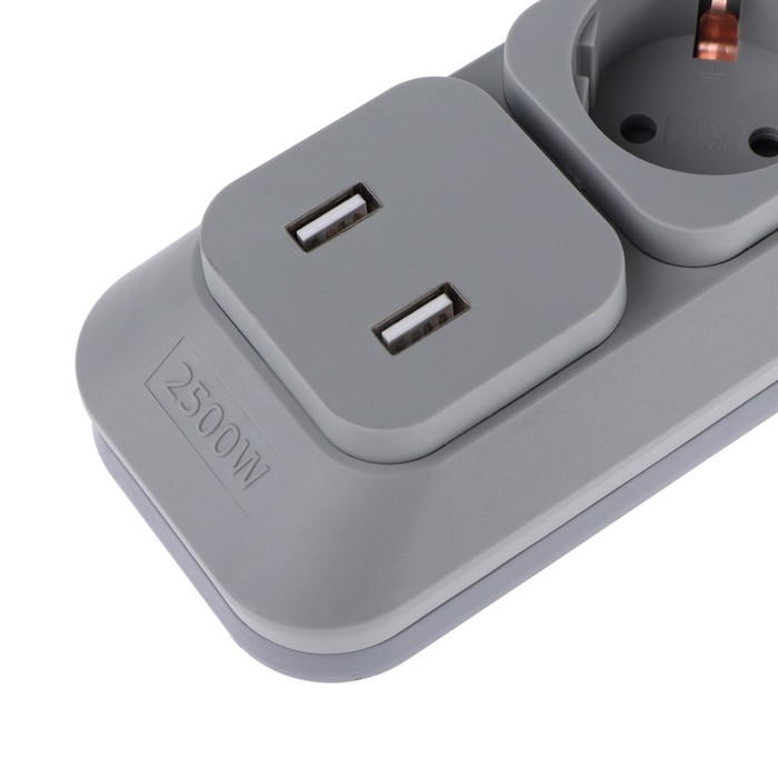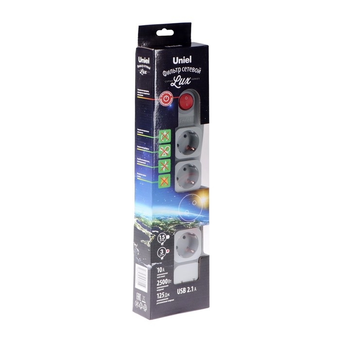 Сетевой фильтр Uniel Lux, 4 розетки, USB 2.1 А, 3 м, 10 А, 2500 Вт, ПВС 3х0.75, с з/к, серый