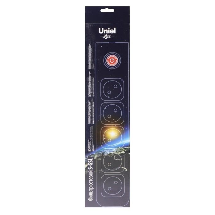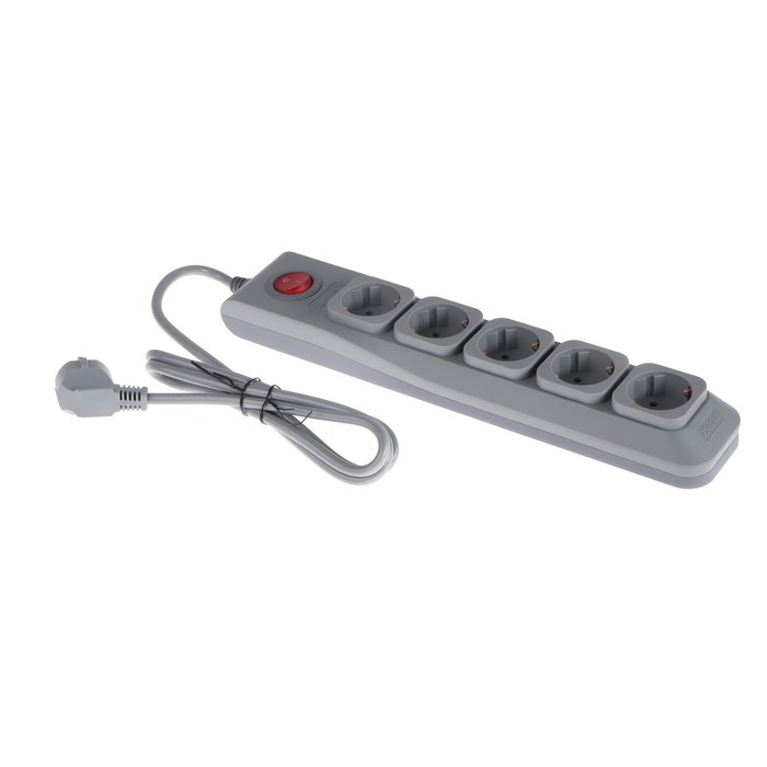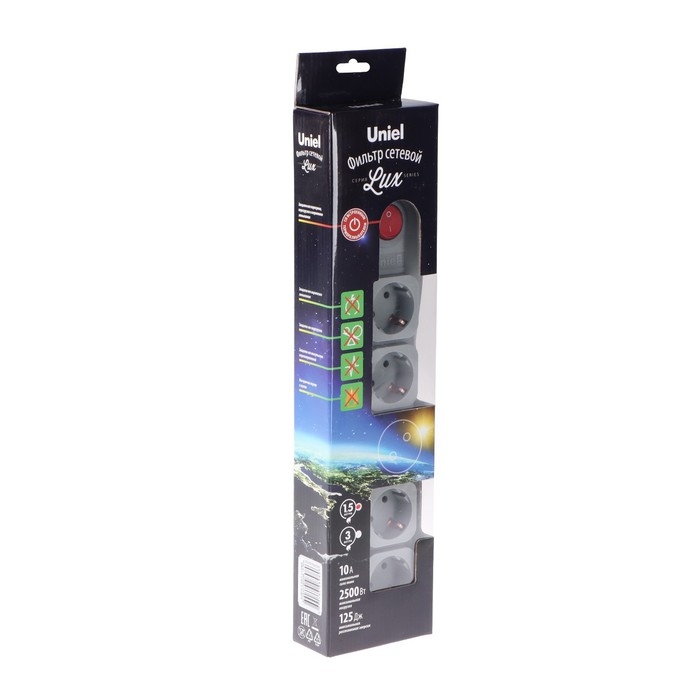 Сетевой фильтр Uniel Lux, 5 розеток, 1.5 м, 10 А, 2500 Вт, ПВС 3х0.75, с з/к, с выкл., серый