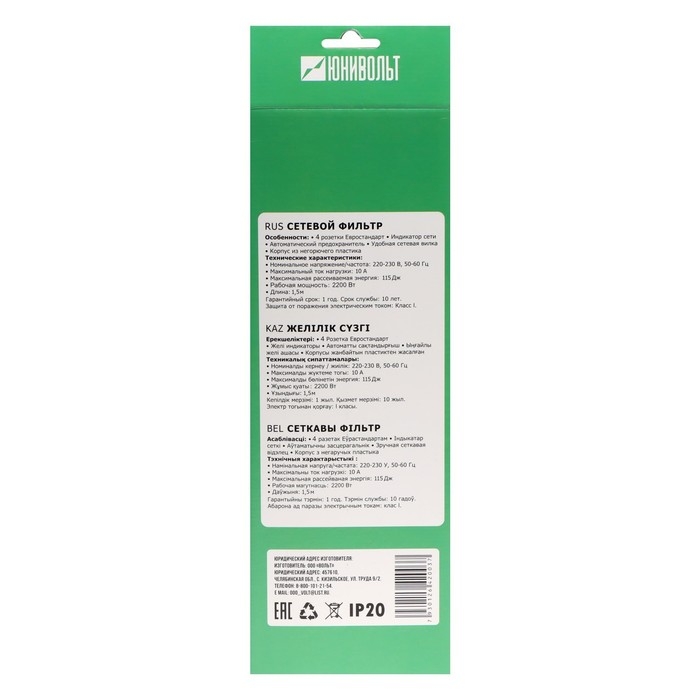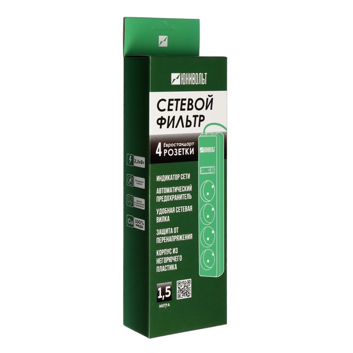 Сетевой фильтр Юнивольт, 4 гнезда, 1.5 м, 10 А, 2200 Вт, с з/к, белый