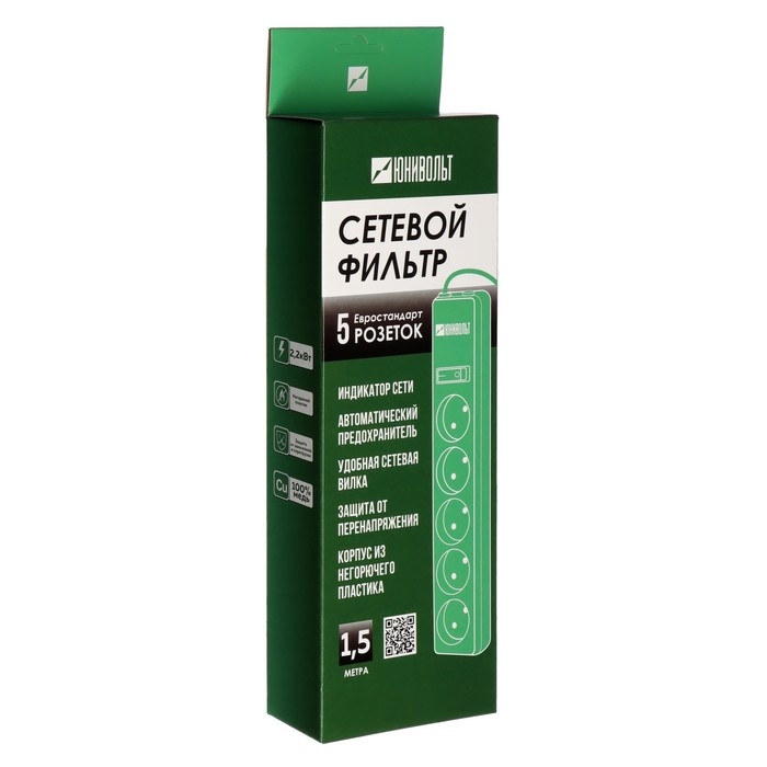 Сетевой фильтр Юнивольт, 5 гнезд, 1.5 м, 10 А, 2200 Вт, с з/к, белый