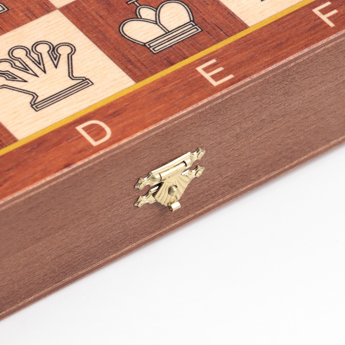 Шахматная деревянная лакированная доска выполнена из бука. Размер доски в разложенном виде 37 х 37 см. Доска имеет аккуратную и надежную фурнитуру и вместительный отсек для хранения. Фигуры приятно и удобно держать в руке. Они выполнены из дерева, имеют привлекательный внешний вид и длительный срок службы.