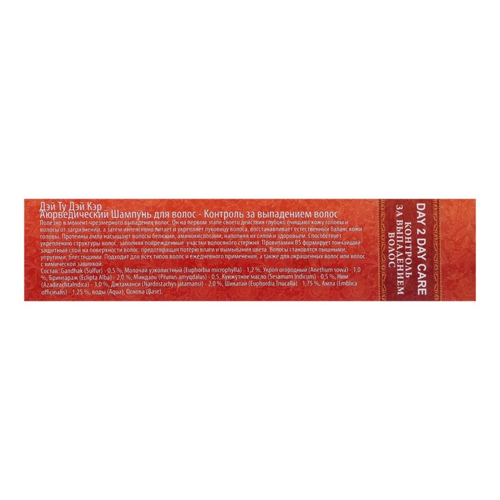 Состав: Gandhak(Silfur)- 0.5%, Молочай узколистый (Chamaesyca microphylla) - 1.2%, Укроп огородный - 1,0%, Брингаради - 2.0%, Миндаль - 0,5% Кунжутное масло - 0,5%, Ним - 3,0%, Шикакай 1,75%, Амла(emblica officinalis)- 1,25%., Вода, Основа шампуня.