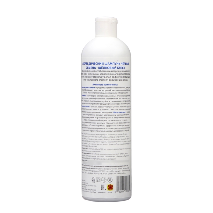 Объем упаковки составляет 500 мл, что позволяет использовать шампунь в течение длительного времени. Продукт производится в Индии и не содержит парабенов и сульфатов.