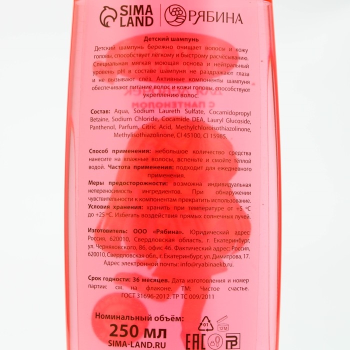 Шампунь для волос детский, 250 мл, аромат клубники, ЧИСТОЕ СЧАСТЬЕ