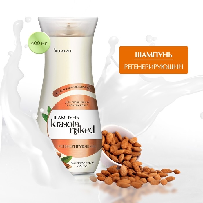 Шампунь для волос Krasota Naked, регенерирующий, 400 мл, предназначен для заботы о окрашенных и ломких волосах, предоставляя им восстановление и защиту. Легкая текстура шампуня обеспечивает бережное очищение волос, создавая нежную пену.