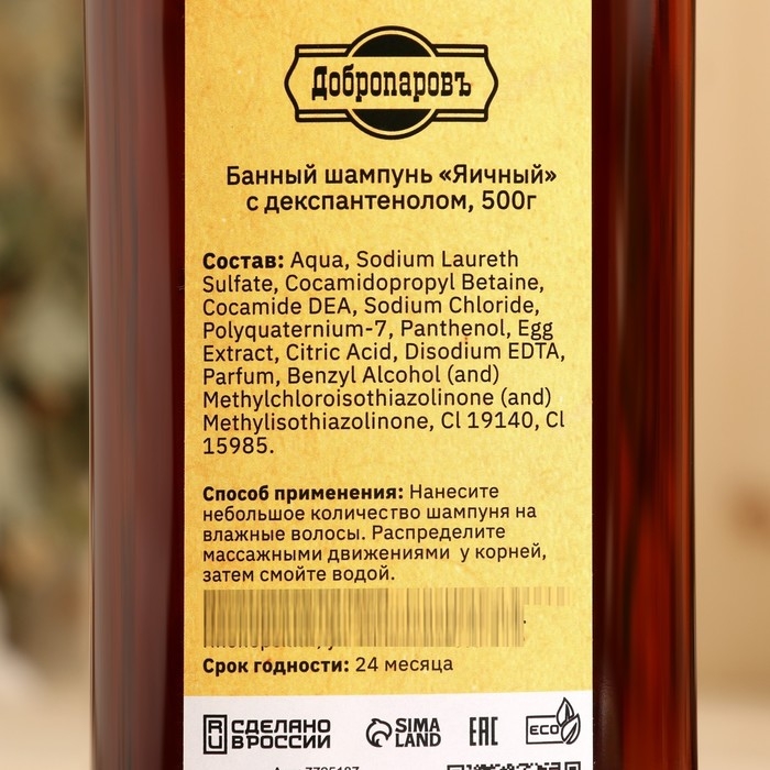 Яичный шампунь придаёт блеск и ухоженный вид волосам, питает клетки кожи головы, активно восстанавливает структуру волос и деликатно очищает. В состав входит декспантенол: он эффективен при восстановлении и увлажнении волос с повреждённой структурой, сухих, безжизненных, окрашенных и с секущимися кончиками. Декспантенол проникает в структуру волоса, питает и увлажняет его изнутри по всей длине: от корней до кончиков, придаёт локонам гибкость, делает упругими, эластичными. Шампунь подходит для всех типов волос.