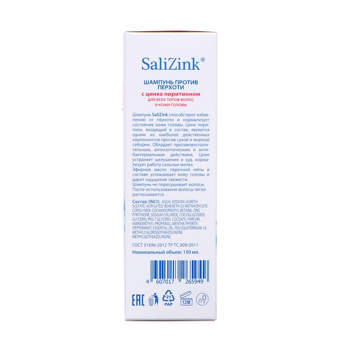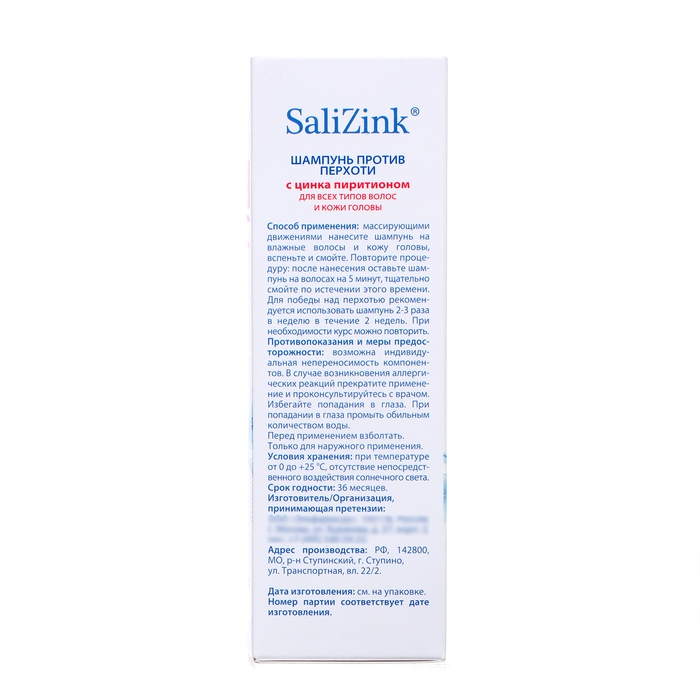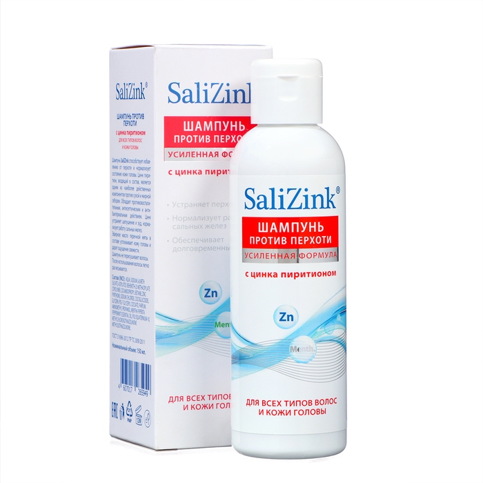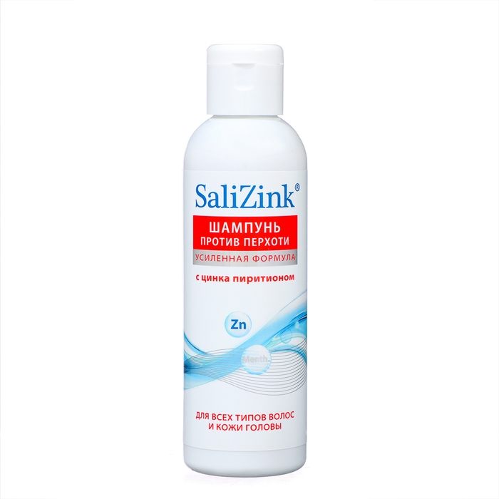 Шампунь SaliZink способствует избавлению от перхоти и нормализует состояние кожи головы. Цинк пиритион, входящий в состав, является одним из наиболее действенных компонентов против сухой и жирной себореи. Обладает противовоспалительным, антисептическим и антибактериальным действием. Цинк устраняет шелушение и зуд, нормализует работу сальных желез. Эфирное масло перечной мяты в составе успокаивает кожу головы и дарит ощущение свежести. Шампунь не пересушивает волосы. После использования волосы легко расчесываются.