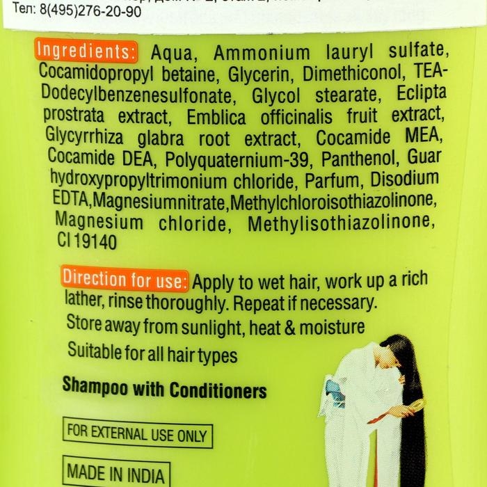 Состав: Amonium lauryl sulfate, Aqua, Cocomidopryl betaine, Glycerin, glycol stearate, Dimethiconol, Tea-dodecylbenzenesulfonate, Cocamide MEA, Cocamide DEA, Polyquaternium-39, Parfum, Nigella sativa (black seed) oil, Guar hydroxyppyltrimonium chloride, Disodium EDTA, Magnesium nitrate, Methylchoroisothiazoline, Magnesium chloride, Methylisothiazolinone, Eclipta prostrata extract, Emblica officinalis fruit extract, Glycyrrhiza glabra root extract, Panthenol, Cl 19140.