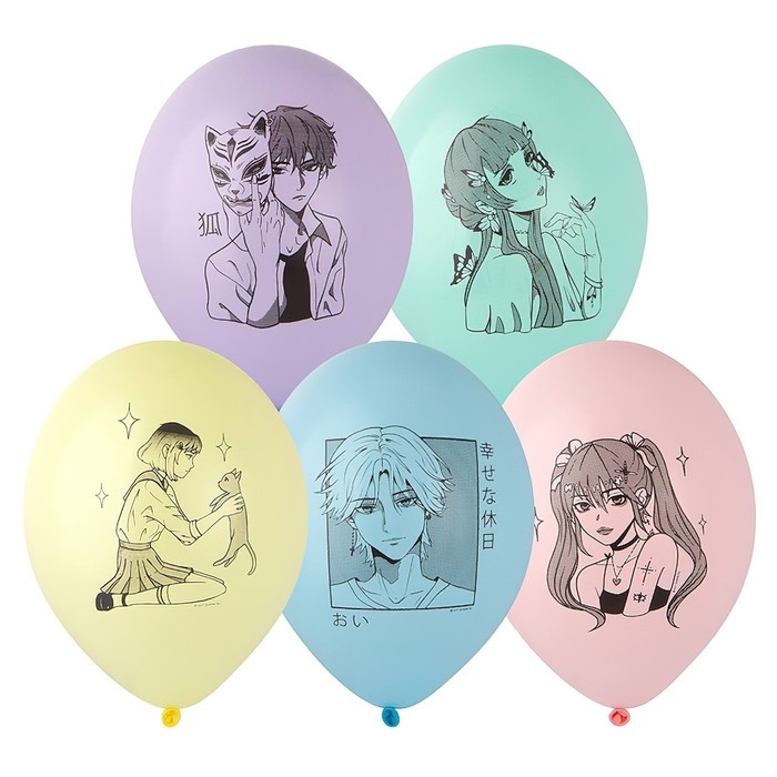 - На шариках рисунки в стиле аниме и надписи на японском языке, что придаёт им особый восточный шарм и выделяет среди других украшений.