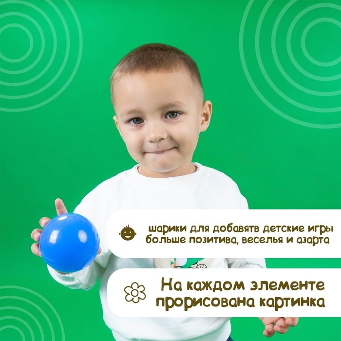 Яркие разноцветные шарики для сухого бассейна добавят в детские игры больше позитива, веселья и азарта! На каждом элементе прорисована картинка: машинка, жирафик, солнышко, цветочек, сердечко, кораблик, улыбка или звёздочка. Шарики выполнены в сочных глянцевых красках, они отлично развивают у малышей восприятие цвета.