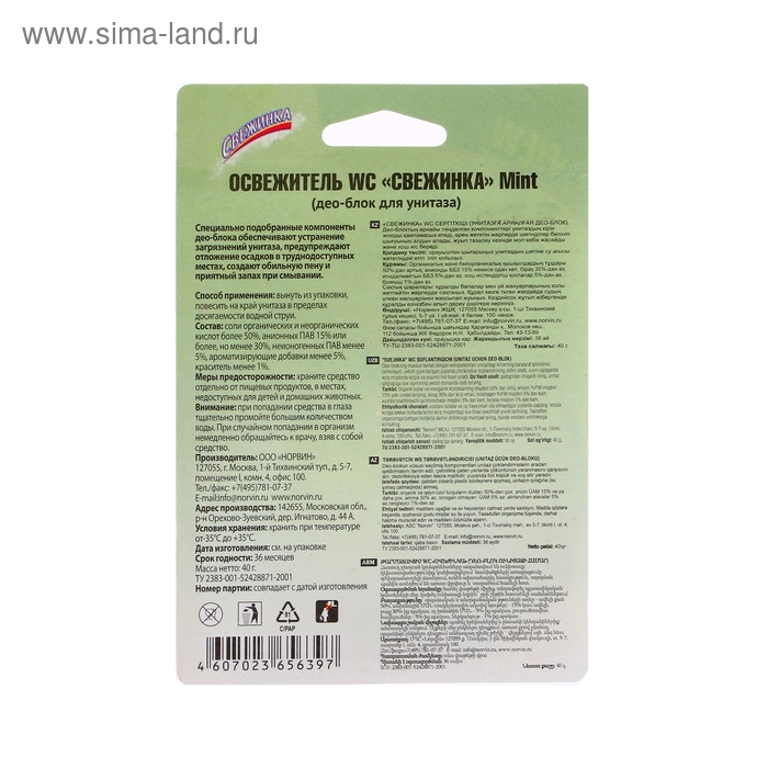 Способ применения: вынуть из упаковки, повесить на край унитаза в пределах досягаемости водной струи.