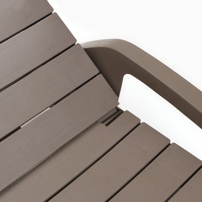 Отличный выбор для тех, кто ценит комфорт, стиль и практичность. Каркас шезлонга выполнен из прочных материалов, устойчивых к износу и атмосферным воздействиям. Покрытие легко чистится, долго сохраняет свой внешний вид и приятно на ощупь. Оригинальный дизайн шезлонга имитирует структуру дерева. Купить шезлонг — значит украсить им любой антураж загородного дома, сада, бассейна или веранды. Шезлонг оснащен удобными обтекаемыми подлокотниками, а также колесами для легкой транспортировки. Особенностью шезлонга Прованс является его спинка, которая имеет пять различных положений наклона, что позволяет обеспечить наиболее комфортное положение тела. Высокая спинка изделия обеспечивает дополнительный комфорт.