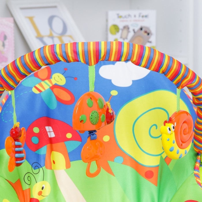 Съемная дуга не регулируется по наклону и оснощена тремя игрушками, две игрушки - погремушки, цетральная игрушка музыкальная и работает от батареек AG13.