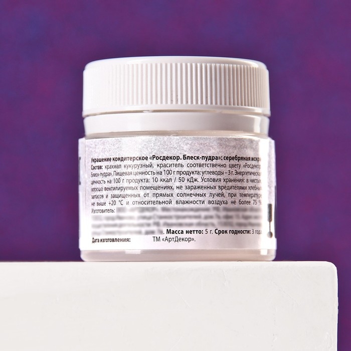 Состав: крахмал кукурузный, краситель соответственно цвету «Росдекор. Блеск-пудра».
