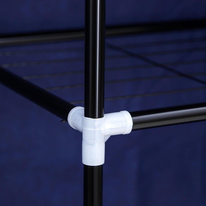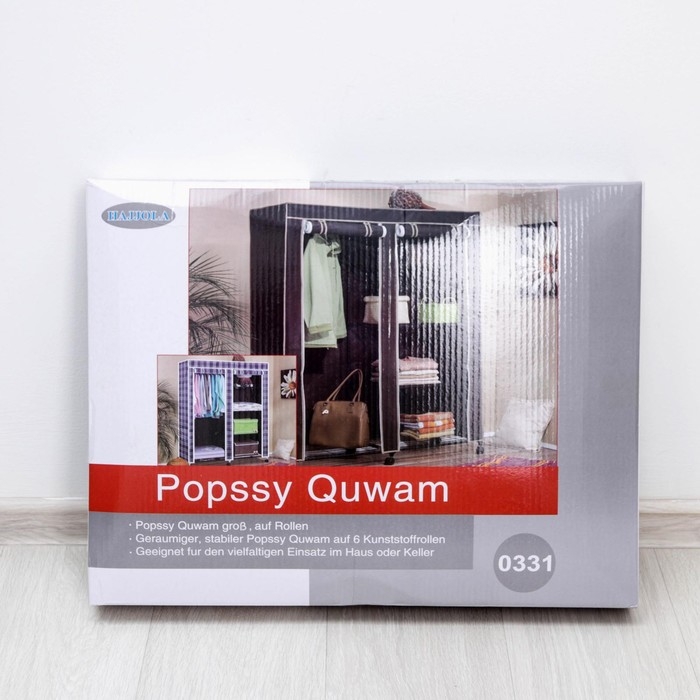 Шкаф представляет собой металлический каркас, обтянутый жёсткой тканью. Конструкция предусматривает промежуточную полку из плотного материала, а также штангу, на которой можно разместить вешалки. Благодаря чехлу ваша одежда будет надёжно защищена от воздействия пыли, грязи, влаги и т. д. Изделие полностью разборное, упаковано в плоскую коробку.