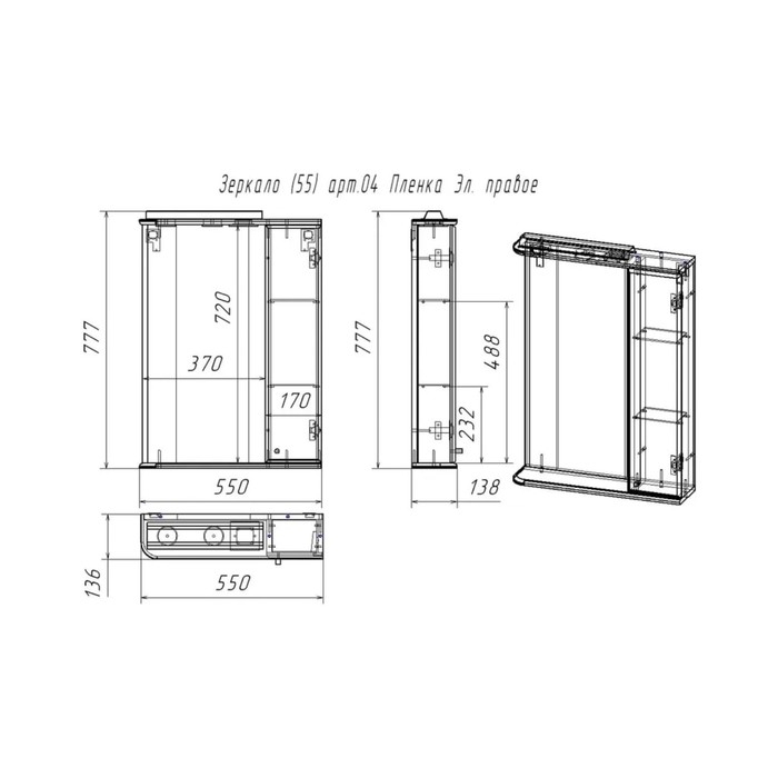 Шкаф-зеркало Spectrum 55, левый, с подсветкой, 55 х 75 х 15 см