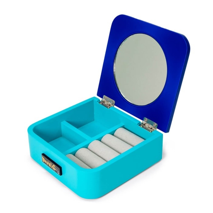 - На внутренней стороне крышки — круглое зеркальце диаметром 85 мм.