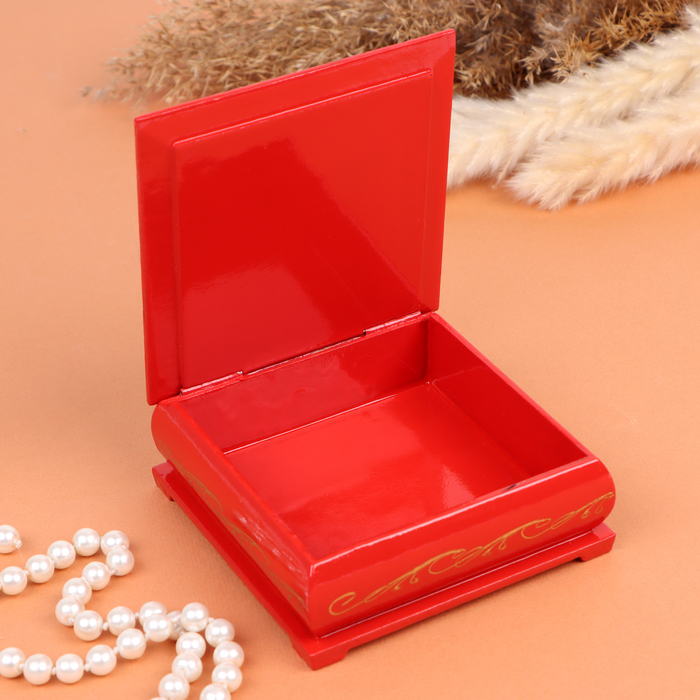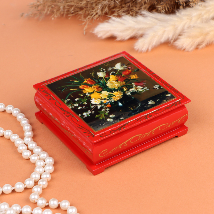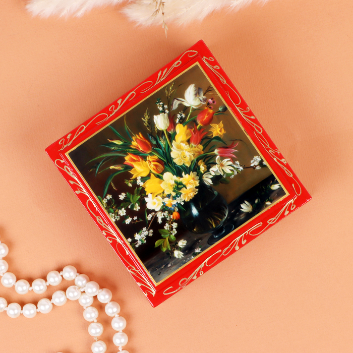 Шкатулка «Цветы в вазе», красная, 10х10 см, лаковая миниатюра