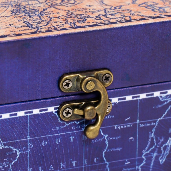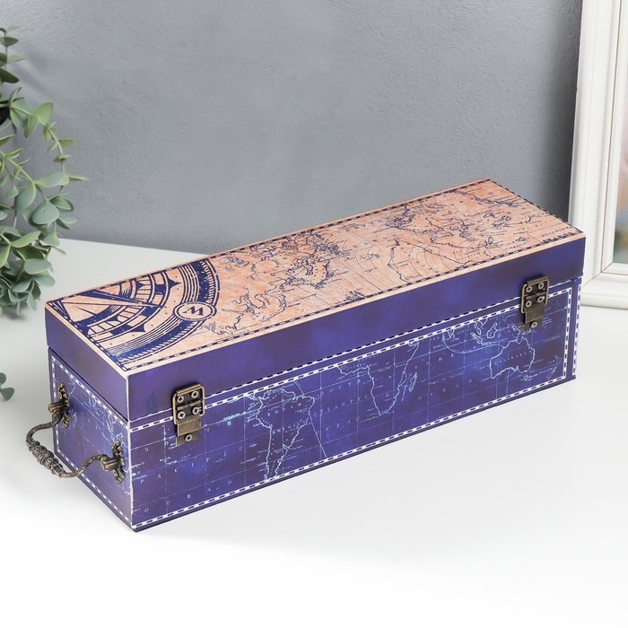 Шкатулка дерево под бутылку "Карта мира" кожзам, синяя 35х11х11 см
